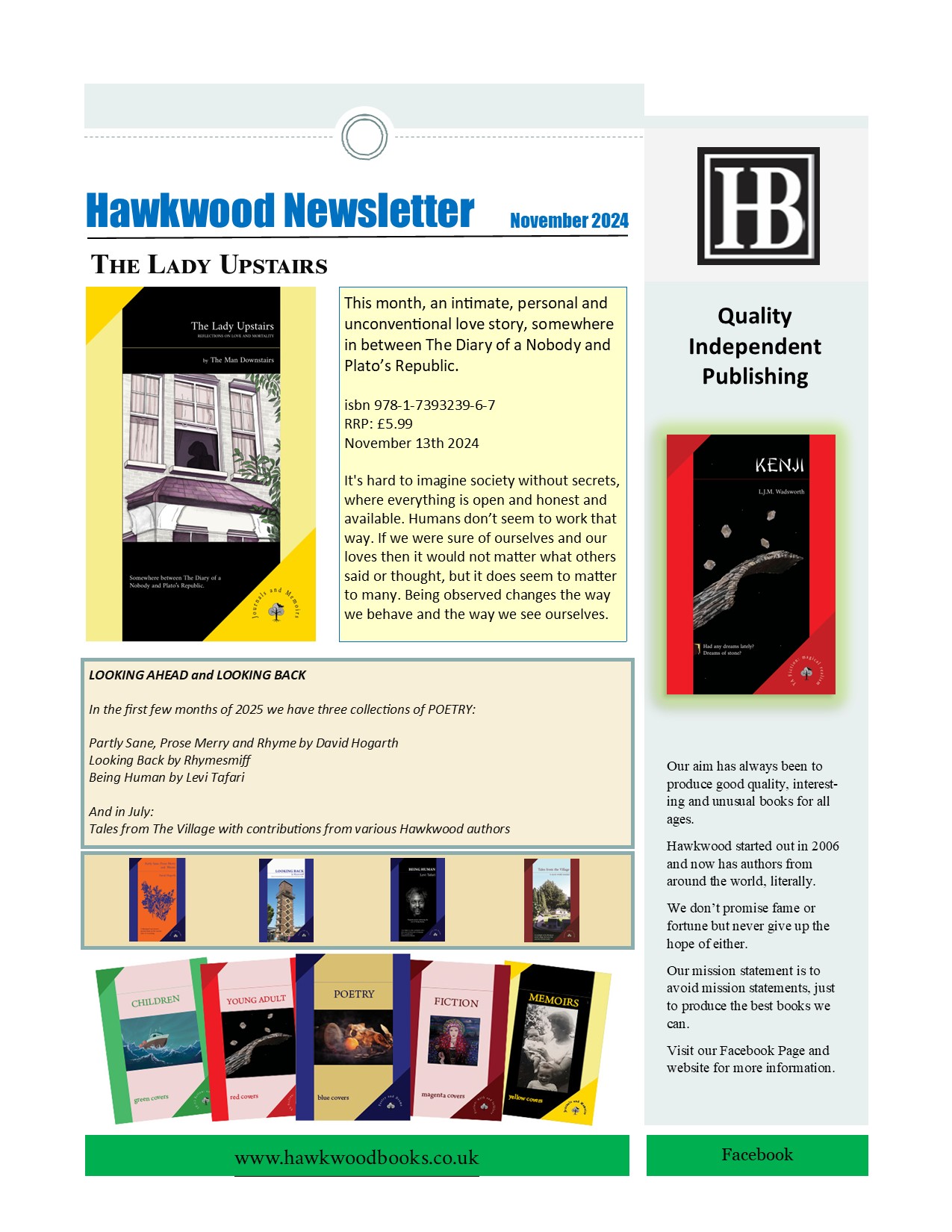 Most current news is now updated on the Hawkwood Books Facebook Page. We don't have Instagram or TikTok and even Facebook is a trial. We still have newsletters as and when appropriate. Some of these are shown below. There may also be some older, bordering on prehistoric, images in the media section. I would, of course, love to be announcing launches in the London Hilton, the O2 Arena or an international event or two, but those newsletters are yet to come. Thank you for looking. | ||||||